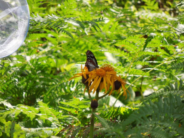 マーキングの仕方を教えていただいて、Uさんとペアになって20頭ほど捕まえてマーキングしました。Uさんは蝶を捕まえるのがとても上手で(Uさんによると昭和の少年時代の経験のおかげ)、あっという間に記録用紙がいっぱいになりました。私はもっぱらマーキング担当で蝶に地域の略称や個体番号を書きました。アサギマダラは鱗粉が少ないので、油性ペンで簡単に文字が書けます。台紙の上に翅を押さえて動かないようにしますが、文字を書いている間はおとなしくしてくれていて、書き終わってもしばらくじっとしています。しばらくするとすくっと立ち上がってひらひらと飛んでいき、再び花に留まって蜜を吸います。