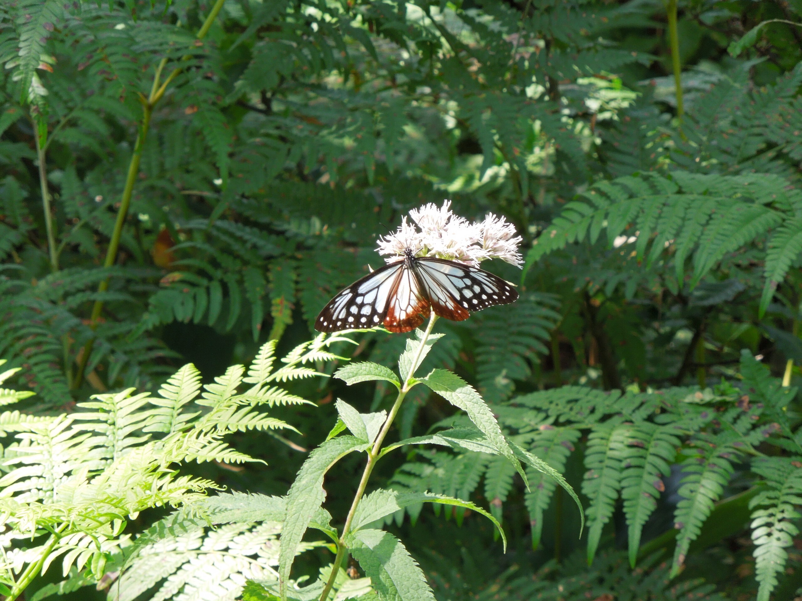 マーキングの仕方を教えていただいて、Uさんとペアになって20頭ほど捕まえてマーキングしました。Uさんは蝶を捕まえるのがとても上手で(Uさんによると昭和の少年時代の経験のおかげ)、あっという間に記録用紙がいっぱいになりました。私はもっぱらマーキング担当で蝶に地域の略称や個体番号を書きました。アサギマダラは鱗粉が少ないので、油性ペンで簡単に文字が書けます。台紙の上に翅を押さえて動かないようにしますが、文字を書いている間はおとなしくしてくれていて、書き終わってもしばらくじっとしています。しばらくするとすくっと立ち上がってひらひらと飛んでいき、再び花に留まって蜜を吸います。