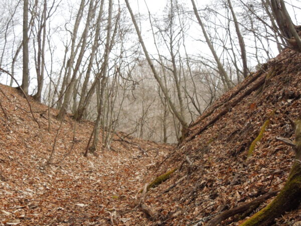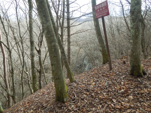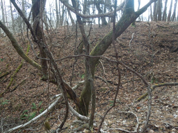 人が通ったはずがないのに、道がくっきりとできています。まるで車が通った跡のようです。雪の降る時期に鹿が通った跡はそのような道になることを教わりました。鹿の道を追っていくと、谷底からは難なく登り降りし、多少遠回りでも倒木は避けて歩いていることが分かります。
