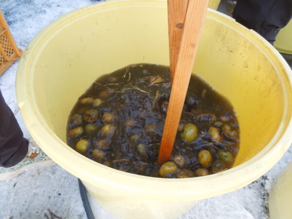 洗ったジャガイモは、袋に詰めて屋外で繊維を凍結させて、発酵させます。来年の春にそれをすりおろして粉を取り出します。
