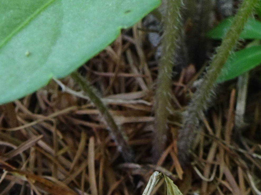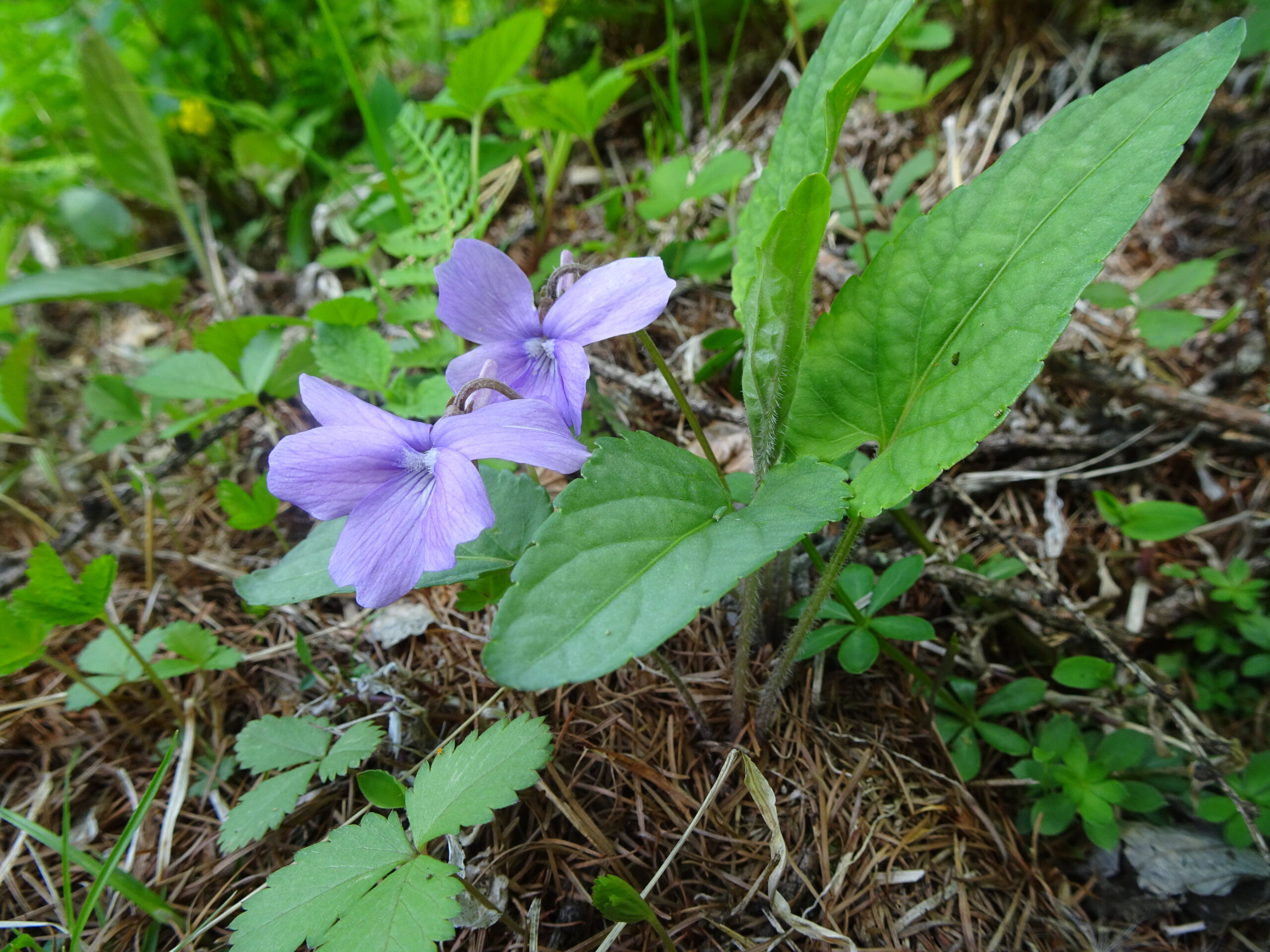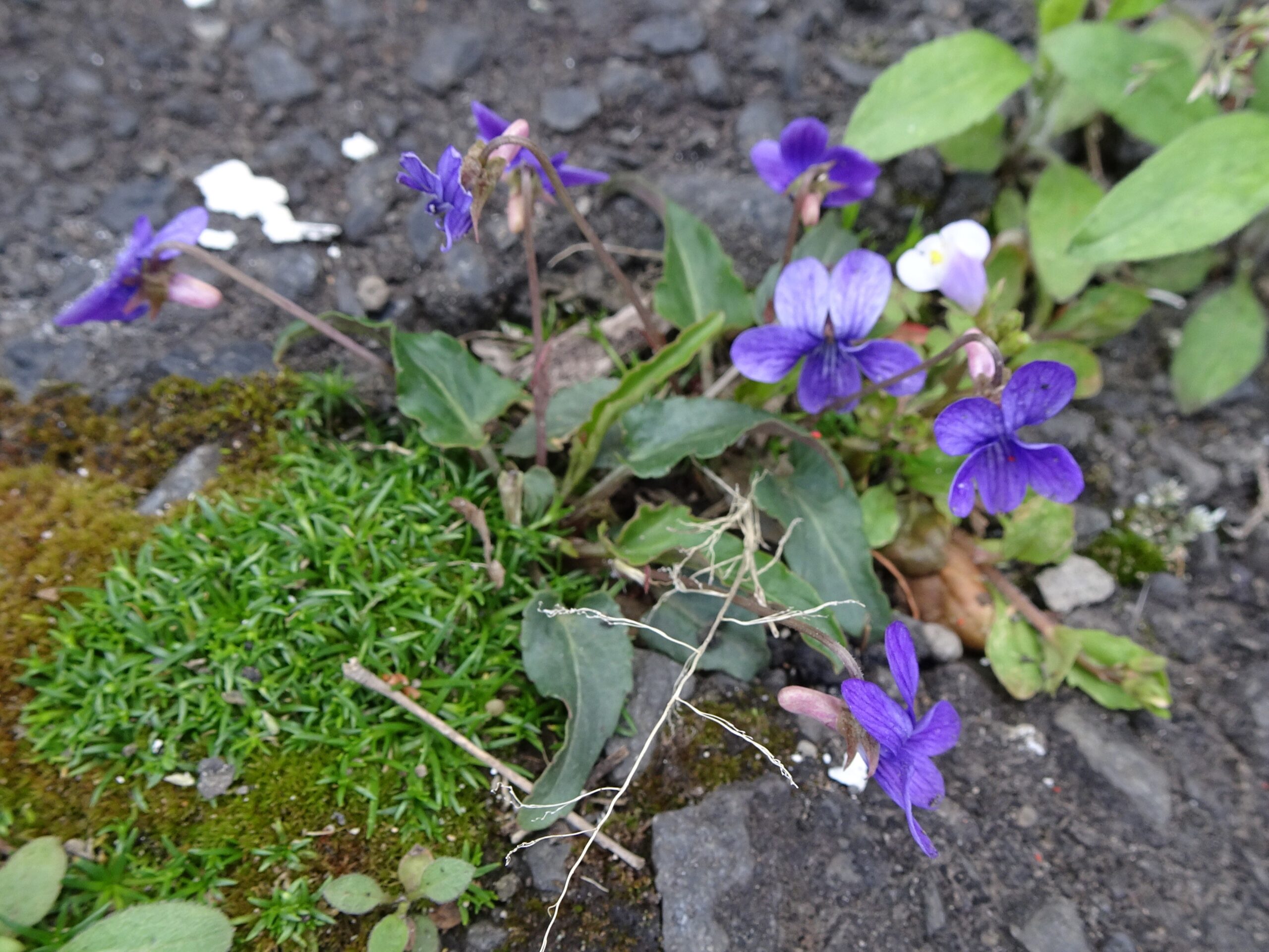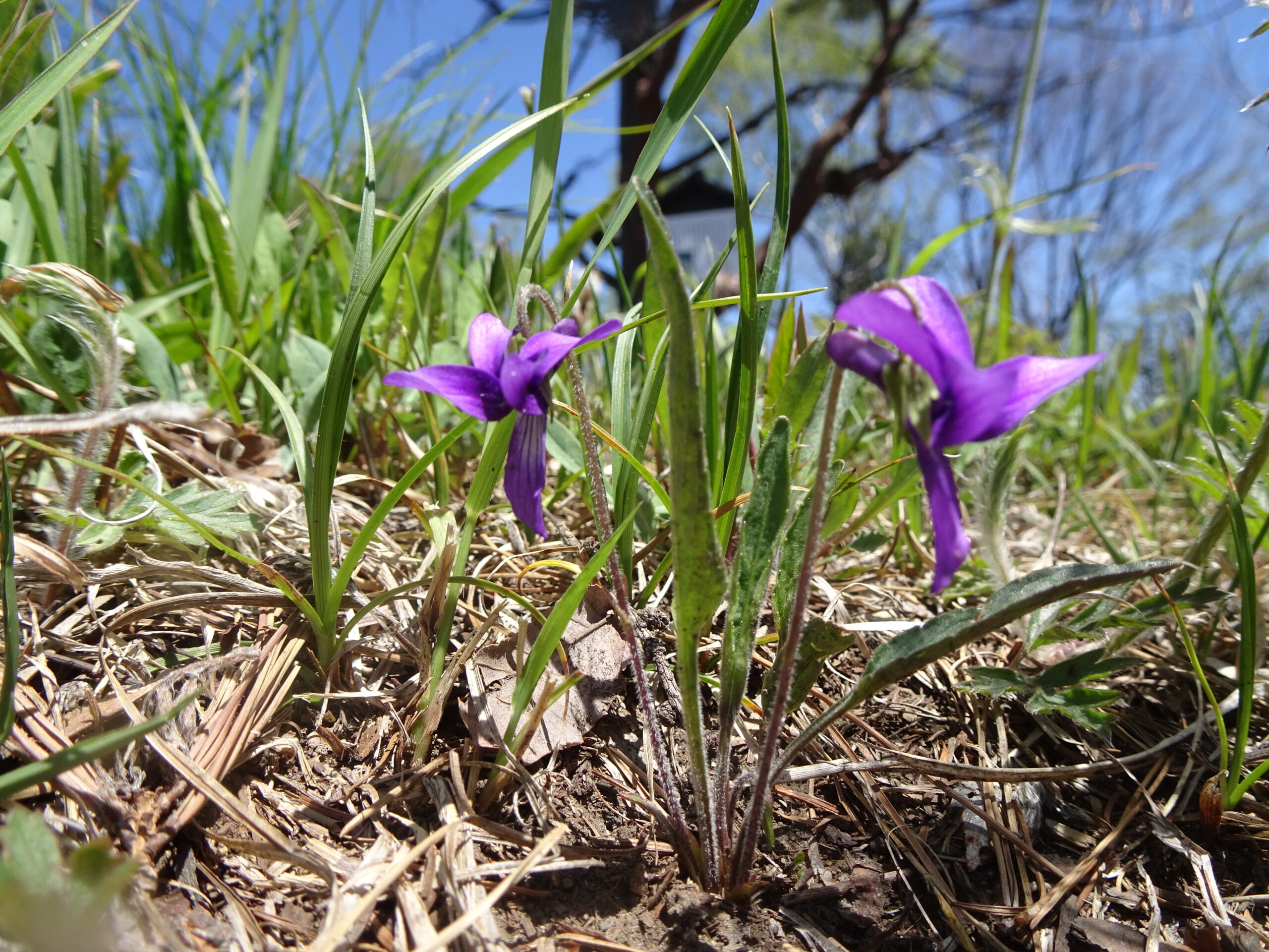 3番はサクラスミレです。このスミレはまず咲いている場所がやや高い草地です。低い所にはありません。このように、姿だけでなく咲いている場所も同定には大切です。サクラスミレの花の色は他の3つに比べ濃い紫ではないです。そして何といっても花が大きいこと。まさにスミレの女王です。茎には毛があります。写真でも分かります。葉っぱは三角形。また、花のつき方に特徴があり、平べったくつきます。次の写真を見て下さい。