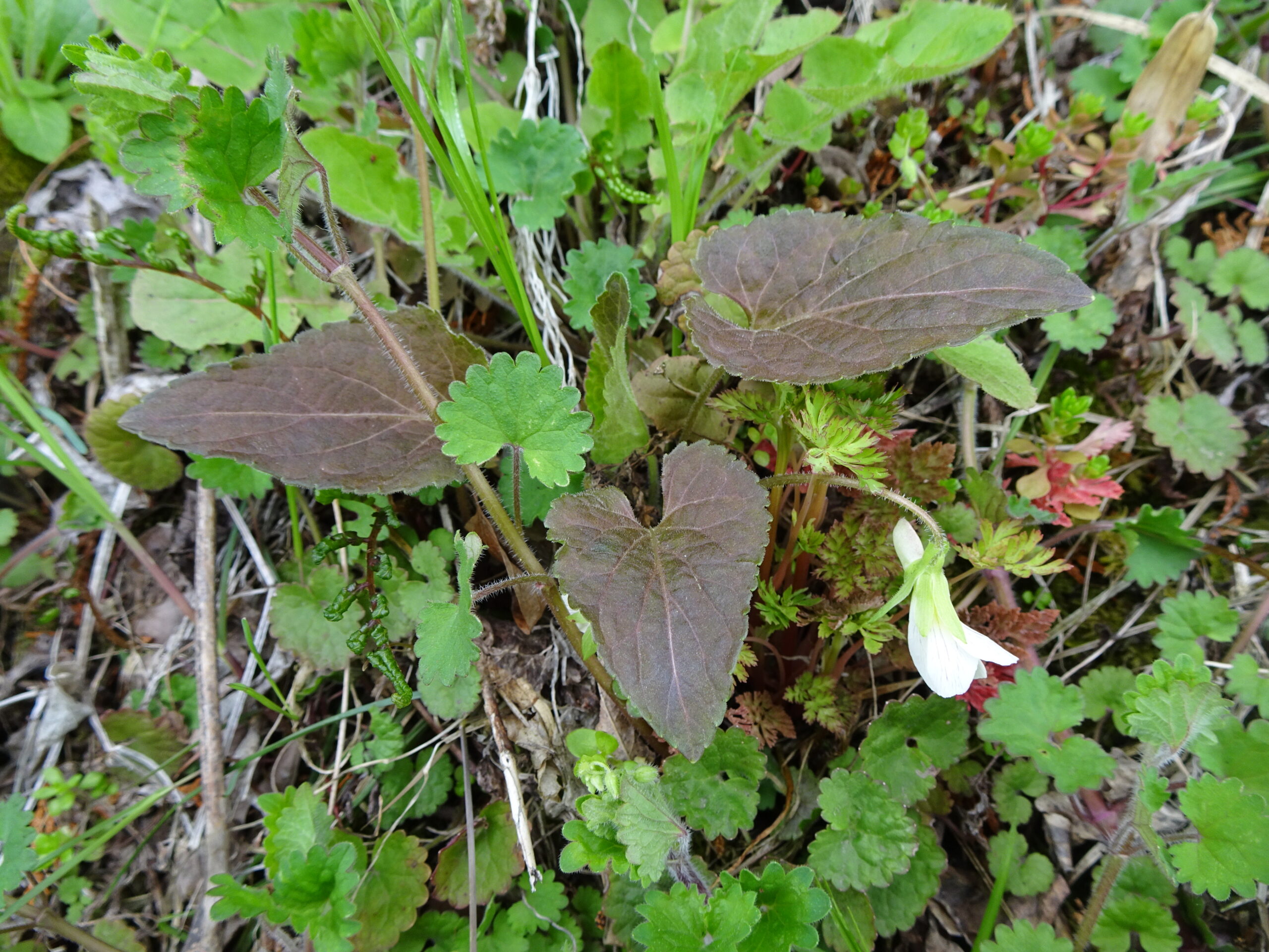 2番はヒカゲスミレです。花が白くて葉が長いハート型ならヒカゲスミレです。このスミレは唇弁(しんべん)に紫のスジが目立つのも特徴です。またヒカゲスミレで忘れてならないのは、葉っぱが焦げ茶色になる個体が出ること。これをタカオスミレと言って区別します。