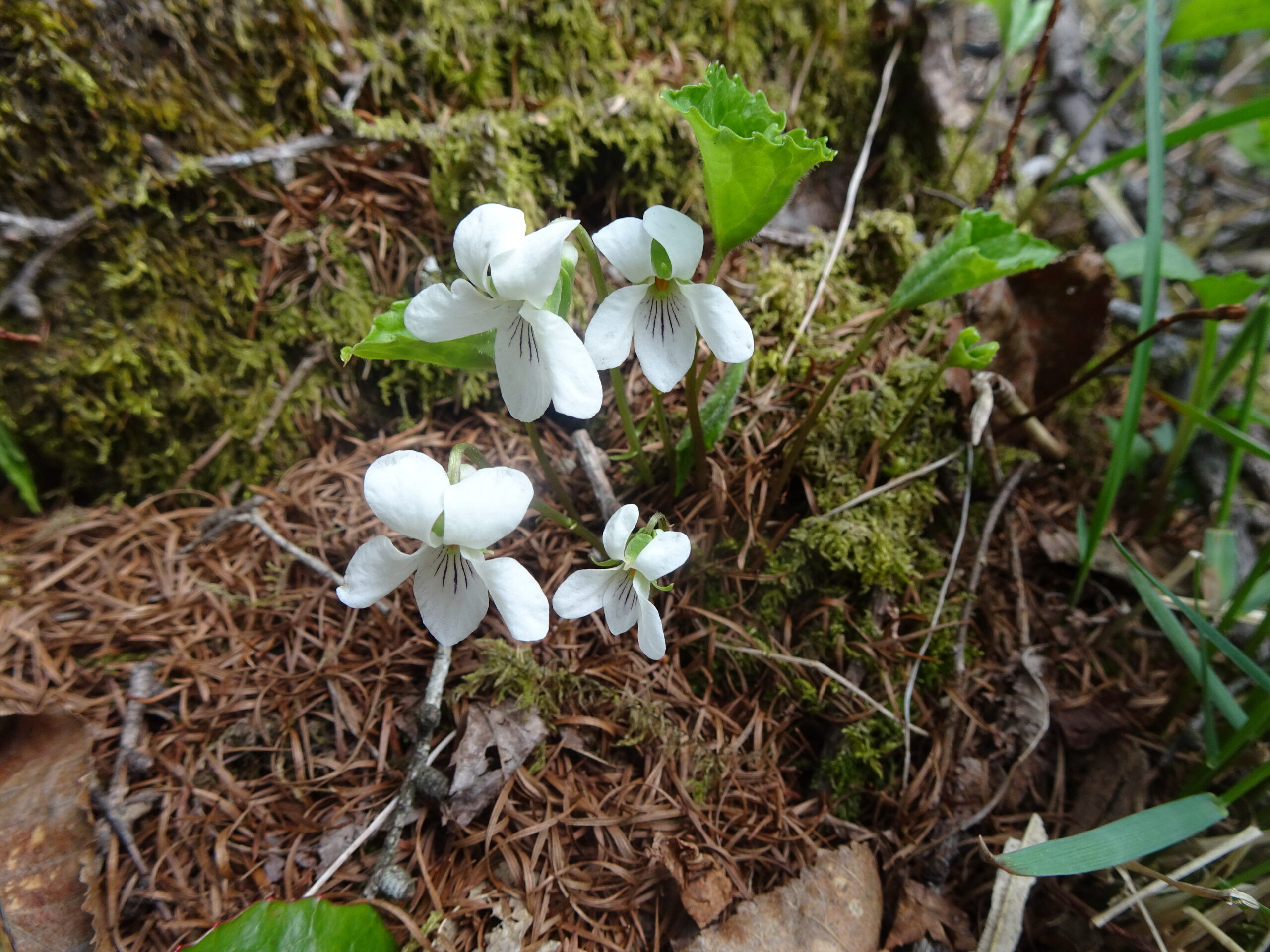 1番は花が咲く時に葉が完全に開いていない。白い花で唇弁に黒紫のスジが入る。ヒメスミレサイシン。