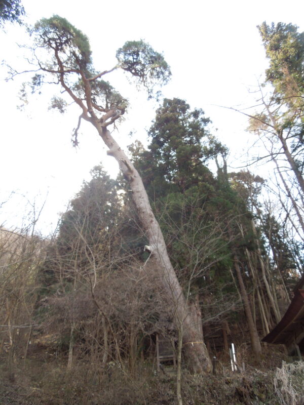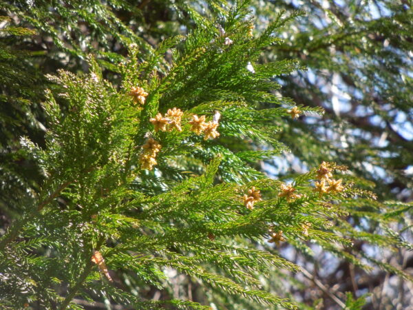 駐車場からハイキング気分で目的地へ。スギがたくさん花をつけています。