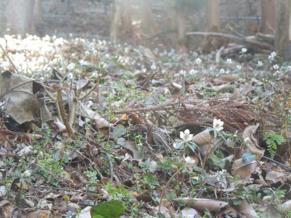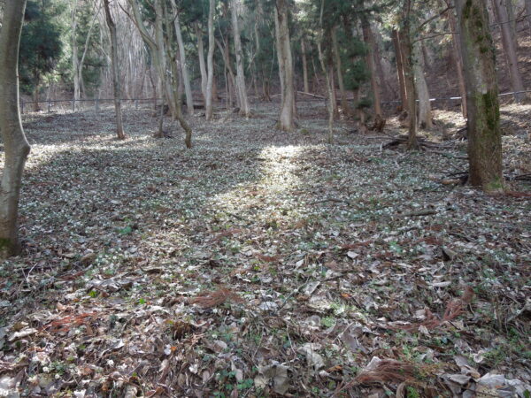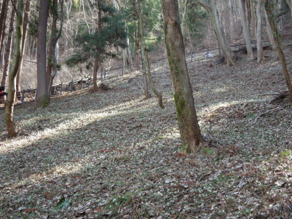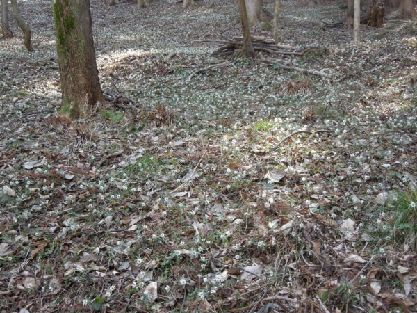 天狗の松を曲がった先に草原が広がっています。この白く見えるのは、もしかして…?そうです。すべてセツブンソウでした。