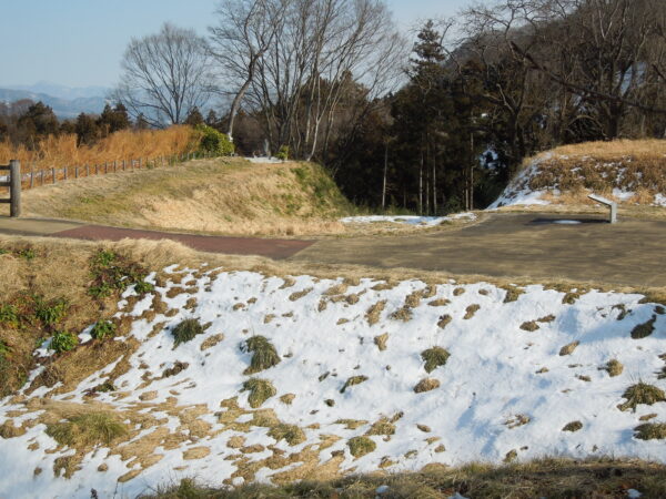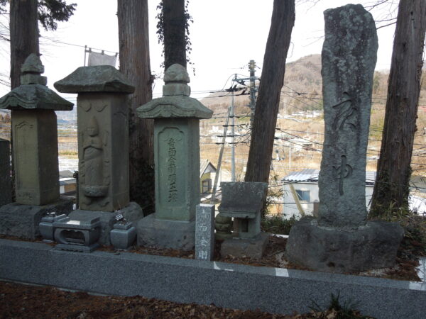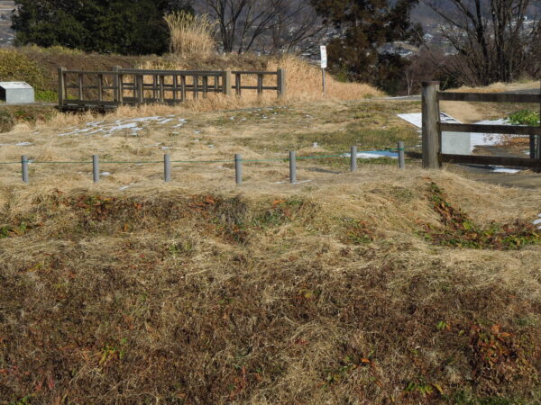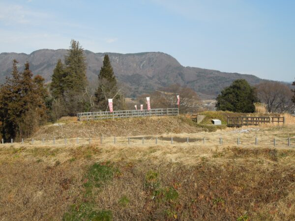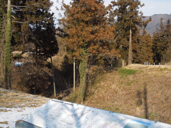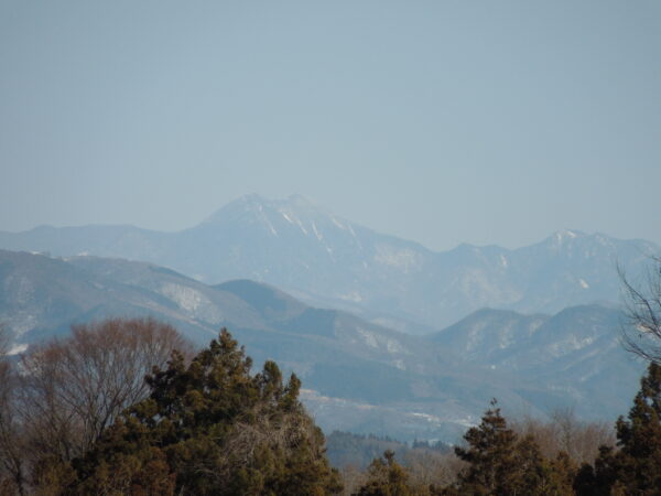名胡桃城址の向こうに石神峠、三峰山が見えています。「心あてに 折らば折らむ 初霜の おきまどはせる 白菊の花」と百人一首でも詠んだ凡河内躬恒(おおしこうちのみつね)がそこに送られ、母の白菊も息子に会おうと追いかけてきましたがここで亡くなりました。そこに追母(おっぽ)薬師堂が建てられました。