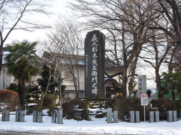 そこは上毛かるたを覚えてから一番気になっていた場所です(「天下の義人 茂左衛門」)。茂左衛門は、沼田城主真田信利の悪政により過酷な年貢(約5倍の増税)と労働を強いられた利根・吾妻・勢多の領民を救うため、命を懸けて徳川綱吉に直訴しました。百姓であったことから直訴は難しく、工夫を凝らして伝えました。そのおかげで沼田藩は改易となり領民が救われることになりましたが、茂左衛門は月夜野の川で捕えられ磔の刑に処せられました。また、茂左衛門の訴状を書いたお坊さんも捉えられ、河原で圧死刑にあいました。