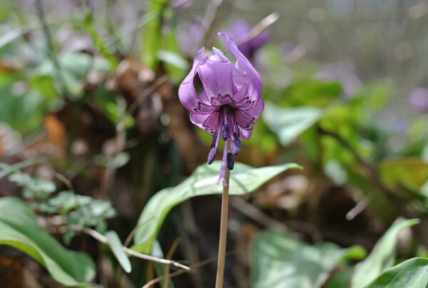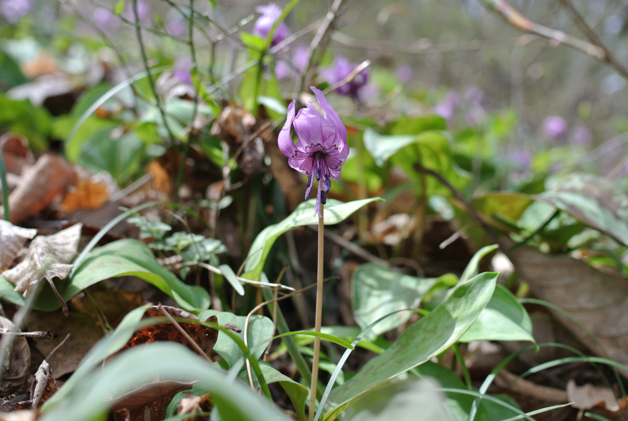 次に、カタクリの群生があるところに連れて行っていただきました。こちらも野生の群落で、とてもきれいに咲いていました。見たことのないほど密集した群落で、夢のような世界でした。(記念写真を撮りましたが、崖から落ちなくてよかったです。)